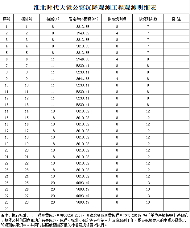 3、工程委托日期:自委托日起至整個施工過程沉降及竣工驗收后一年內(如滿足沉降規(guī)范范圍合格可停止觀測如不滿足規(guī)范需自行增加觀測直至沉降滿足規(guī)范標準后停止,費用包含在總價內)為沉降觀測期?!?br /> 4、沉降觀測任務(內容)與執(zhí)行技術標準: