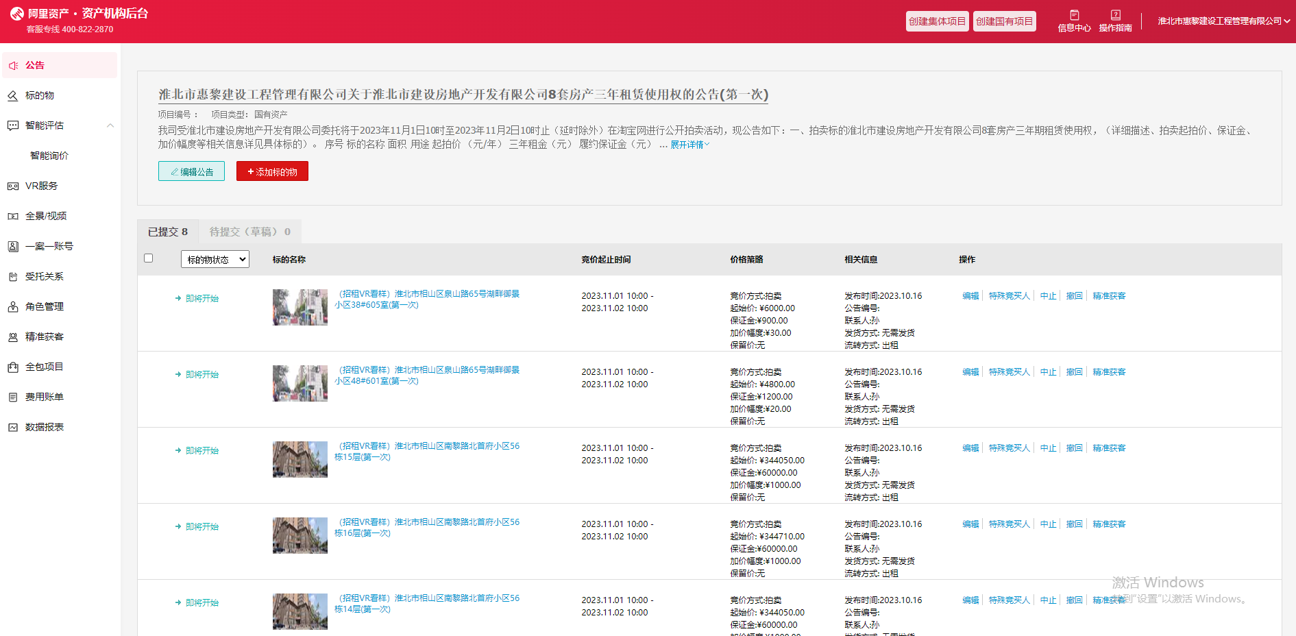 為盤(pán)活集團(tuán)公司國(guó)有資產(chǎn),確保國(guó)有資產(chǎn)保值增值,淮北市惠黎建設(shè)工程管理有限公司積極對(duì)接阿里平臺(tái),完成入駐流程。成功發(fā)布淮北市建投房地產(chǎn)開(kāi)發(fā)有限公司8處房產(chǎn)三年期租賃權(quán)掛網(wǎng)拍租。通過(guò)制定拍賣(mài)方案,對(duì)標(biāo)的物制作VR虛擬現(xiàn)實(shí),讓意向競(jìng)買(mǎi)人多方位了解標(biāo)的物詳情。