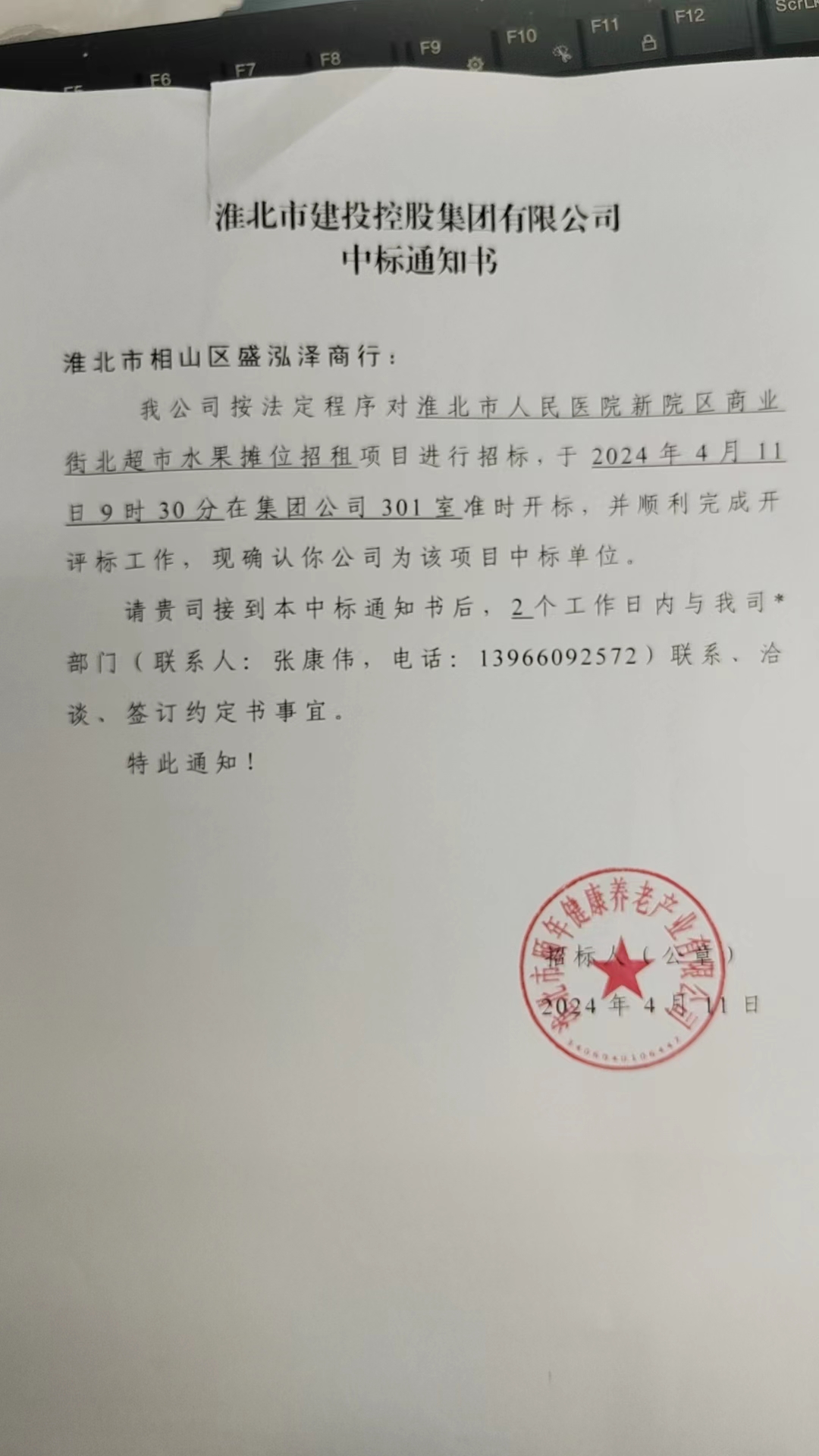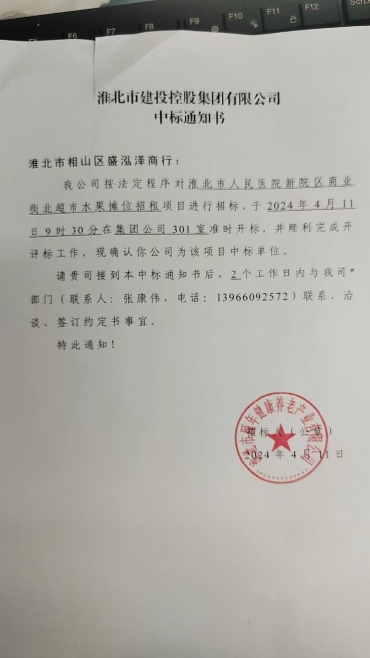 我公司按法定程序?qū)?/span>淮北市人民醫(yī)院新院區(qū)商業(yè)街北超市水果攤位招租項目進行招標,于2024年4月11日9時30分在集團公司301室準時開標,并順利完成開評標工作,現(xiàn)確認你公司為該項目中標單位。
