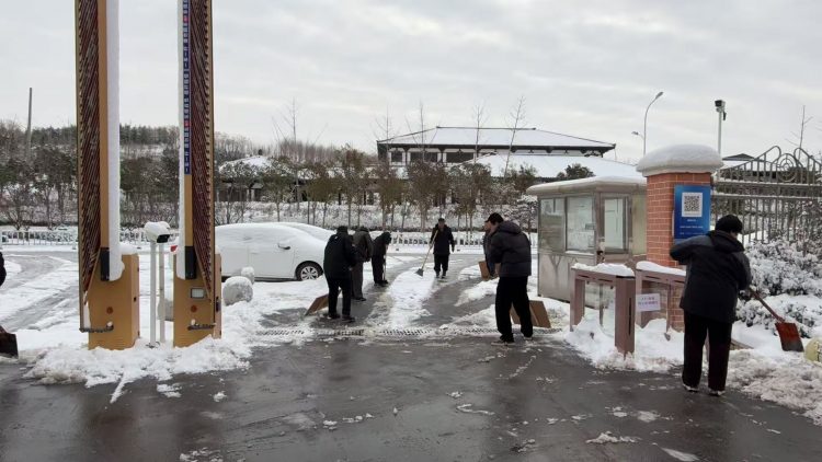 保安公司對(duì)辦公樓前、主干道等區(qū)域的積雪進(jìn)行人工清理,重點(diǎn)鏟除路面結(jié)冰區(qū)域,確保人員與車輛通行安全。