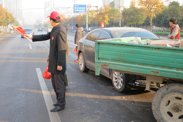 活動現(xiàn)場,志愿者們頭戴志愿者服務(wù)帽,手拿文明勸導(dǎo)小紅旗,協(xié)助交警維護交通秩序,處理突發(fā)交通事故,積極幫助尋找走失親人的外地老鄉(xiāng)聯(lián)系電臺、救助站……在活動過程中,盡管氣溫很低,但是志愿者們對老弱殘者或路人都會提供熱情的幫助,為他們排憂解難。