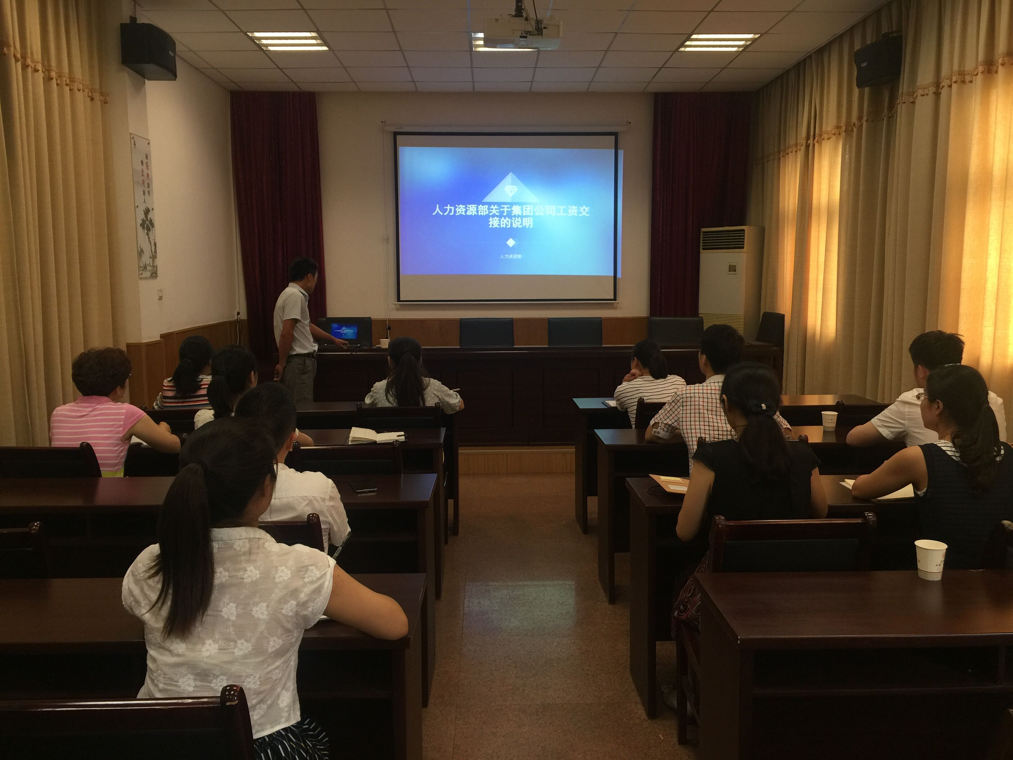 會上,人力資源部唐海峰通過PPT模式,對工資中的基薪、預支效益薪、勞務派遣人員費用制作等三部分工作進行了詳細的介紹。