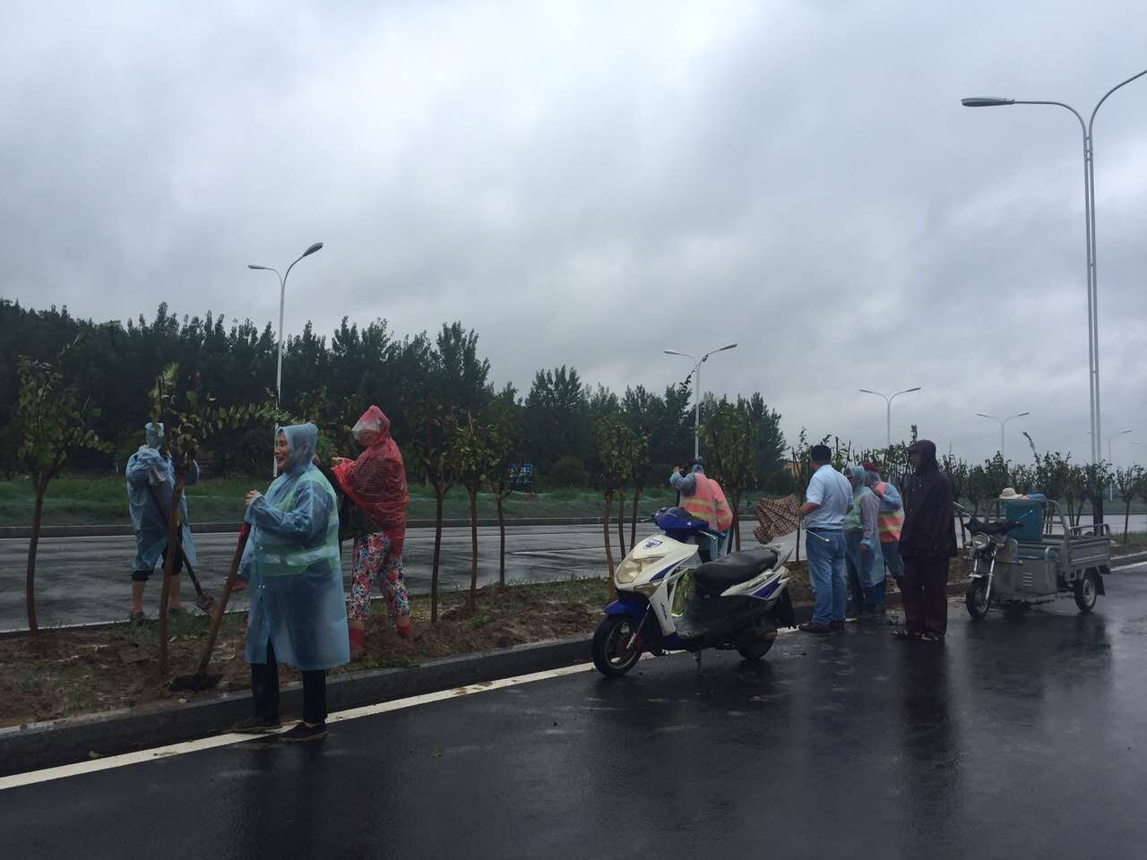 生態(tài)景觀(guān)公司為確保樹(shù)木成活率,雨中搶種綠化樹(shù)木