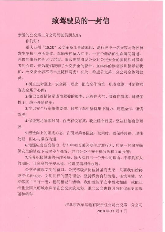 因此,公交第二分公司組織全體駕駛員進(jìn)行警示教育學(xué)習(xí),并向每一位公交司機(jī)師傅致一封信,讓師傅們時(shí)刻牢記作為司機(jī),當(dāng)你坐在駕駛座上,手握方向盤(pán)時(shí),就應(yīng)有清晰的認(rèn)識(shí)。此時(shí)你握著的,不僅僅是自己的性命,更是與你同車(chē)的人、和路上與你擦肩而過(guò)的無(wú)數(shù)人的安全。平白無(wú)故挨了打,怒從膽邊生,生氣都在所難免。時(shí)刻樹(shù)立生命至上、安全第一理念,把安全作為第一職責(zé)底線(xiàn),將乘客安全系于心間。