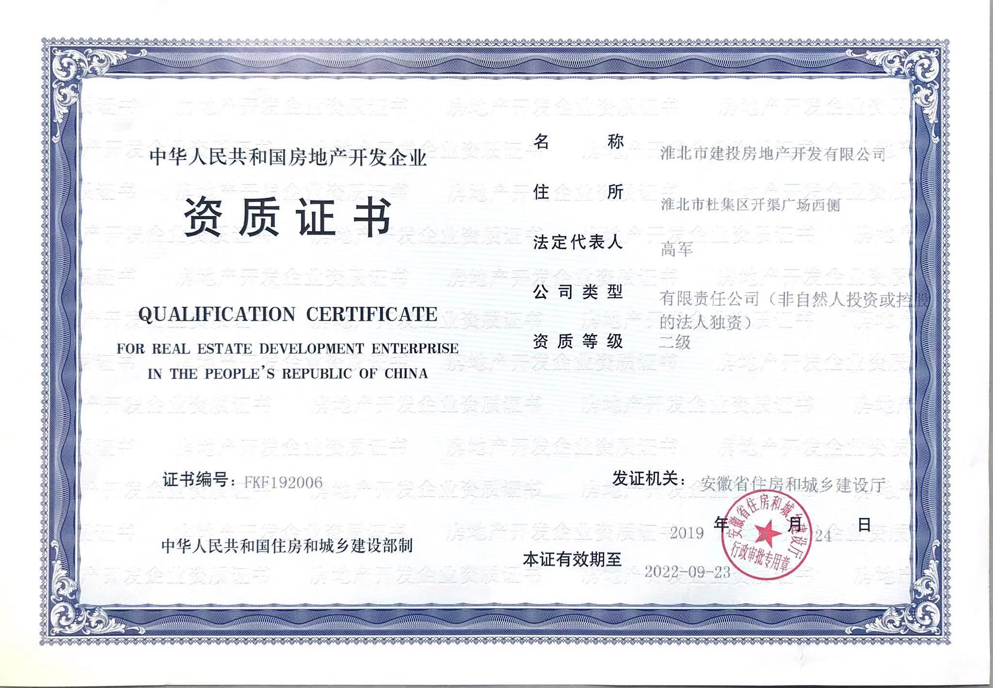 2019年9月24日,經(jīng)安徽省住房和城鄉(xiāng)建設(shè)廳核準(zhǔn)并向淮北市建投房地產(chǎn)開發(fā)有限公司頒發(fā)了房地產(chǎn)開發(fā)企業(yè)二級資質(zhì)。據(jù)悉,淮北市僅有5家房地產(chǎn)企業(yè)取得房地產(chǎn)開發(fā)二級資質(zhì)。二級開發(fā)資質(zhì)的成功取得,標(biāo)志著房地產(chǎn)公司專業(yè)資質(zhì)實現(xiàn)了跨越提升,公司將在市場開發(fā)、投資經(jīng)營、項目推廣和融資信貸、品牌信譽等方面邁上嶄新的臺階,獲得更多市場機遇,為在全國范圍內(nèi)承攬房地產(chǎn)開發(fā)項目、全方位參與市場競爭奠定了堅實的基礎(chǔ)。
